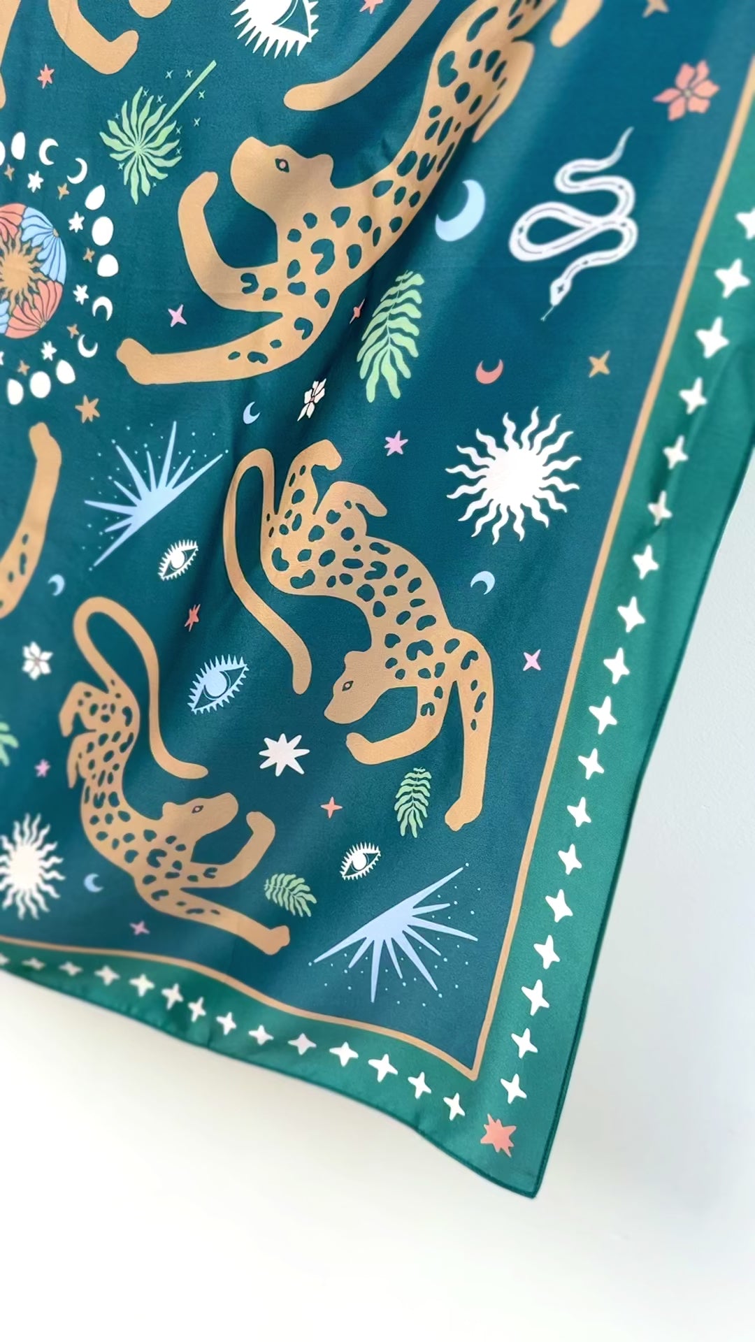 This scarf design tells a story: the Jaguar, a sacred protector of the Mayan jungle, symbolizes strength, protection, and the divine feminine. Surrounding it, celestial symbols—the sun, moon, and stars—guide your journey, while the wise serpent and protective eye offer strength and vision.